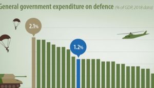 Ας εξετάσουμε την περίπτωση της Ελλάδας, μιας καταχρεωμένης χώρας, με χρόνια ύφεση, που δαπανά το 2,1 % του ΑΕΠ της σε αμυντικές δαπάνες (το μεγαλύτερο ποσοστό στην Ε.Ε.).